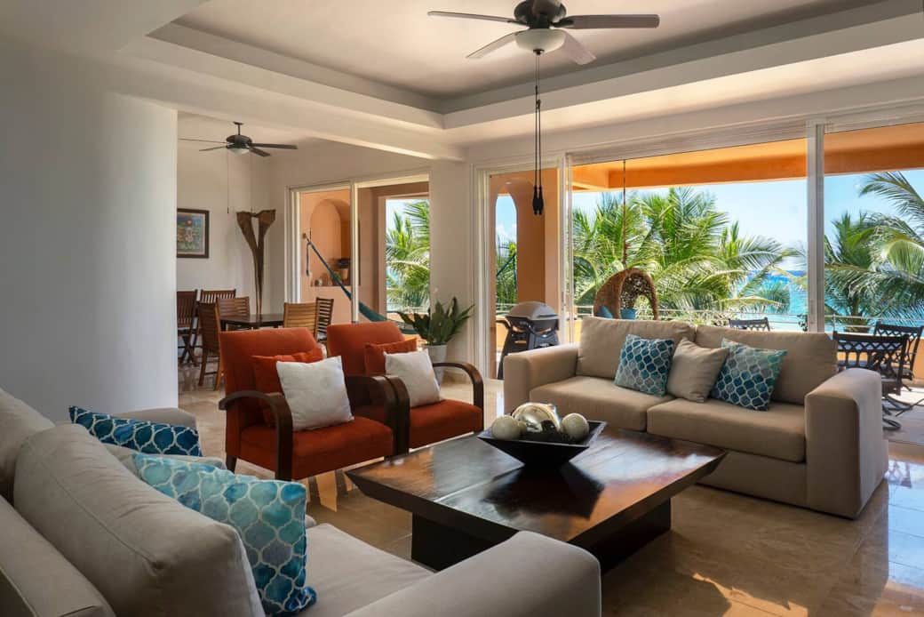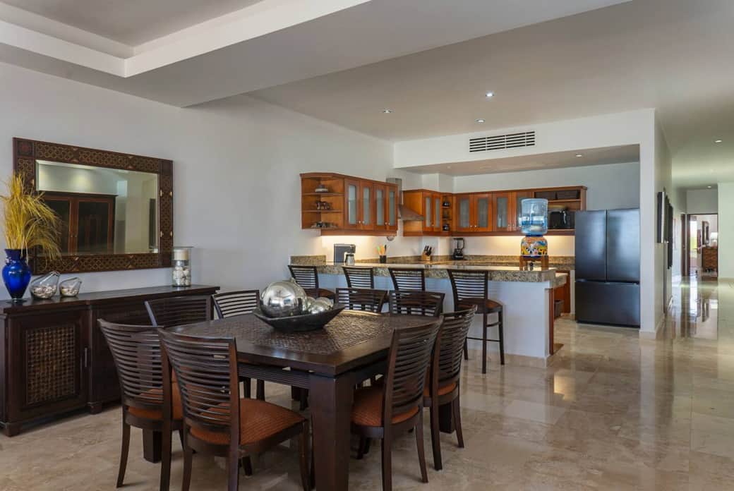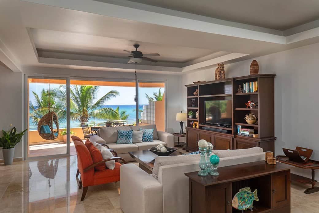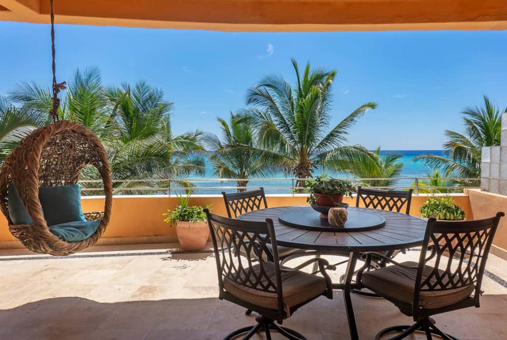 Balcony with rope swing, outdoor dining, weber grill and seafront view.